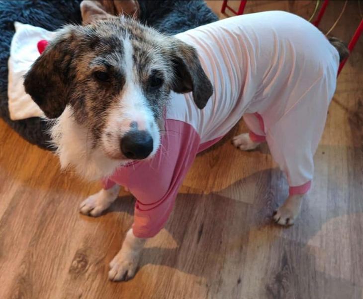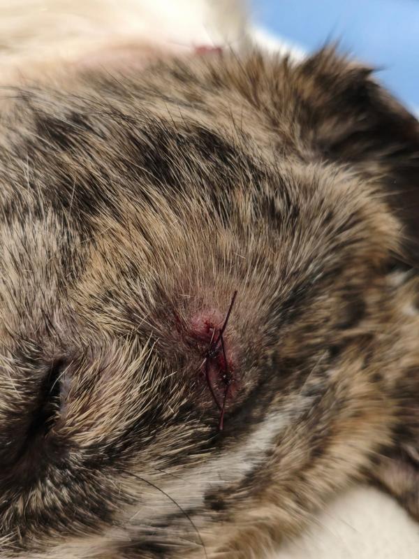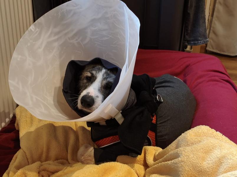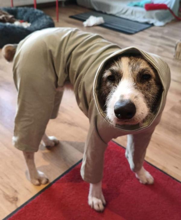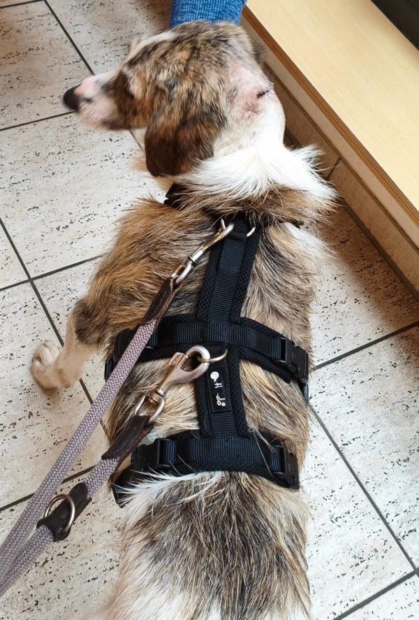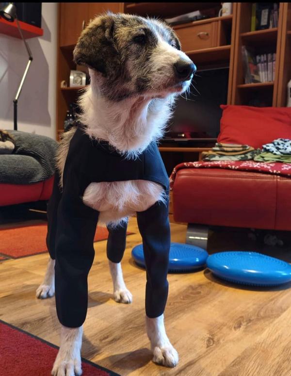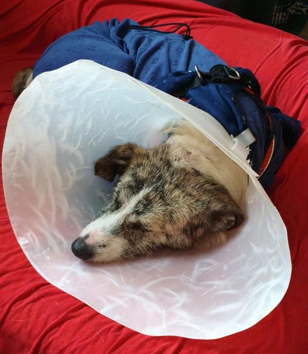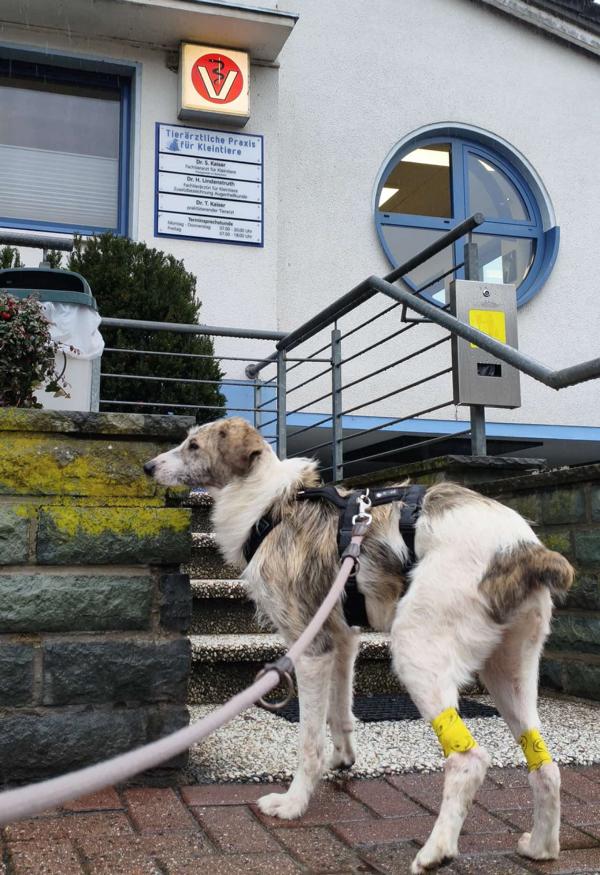 Kalu wurde regelrecht "zusammengeflickt" - hat aber alles sehr gut mitgemacht und auch weggesteckt. Schon kurz nach der OP stand er schon wieder "Körperwedelt" vor uns. Was ein Kämpfer und einfach nur Goldschatz. Wir haben nun ein extra Geschirr und Trichter besorgt, damit die größte Wunde am Hals gut verheilen kann und Nichts daran reiben kann.