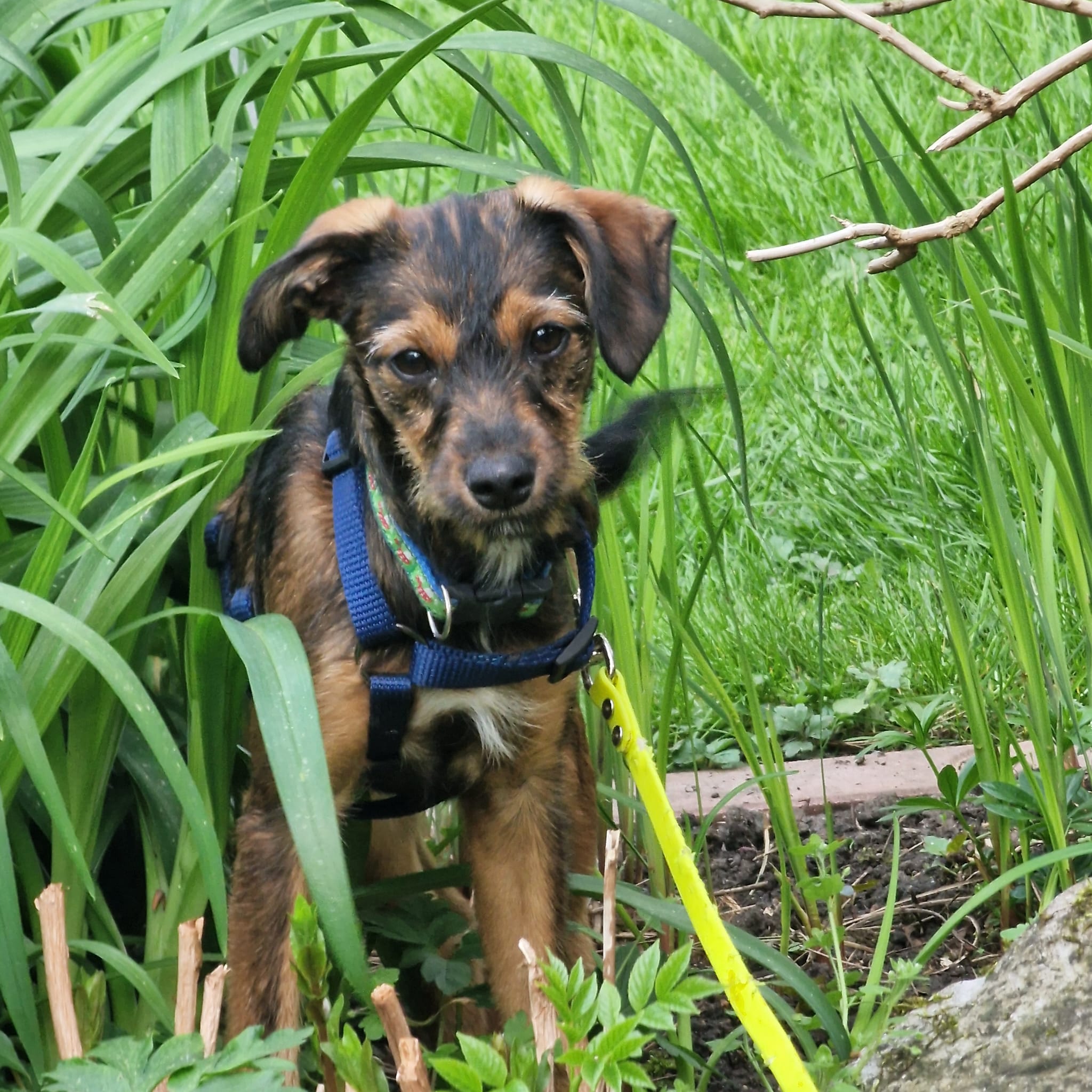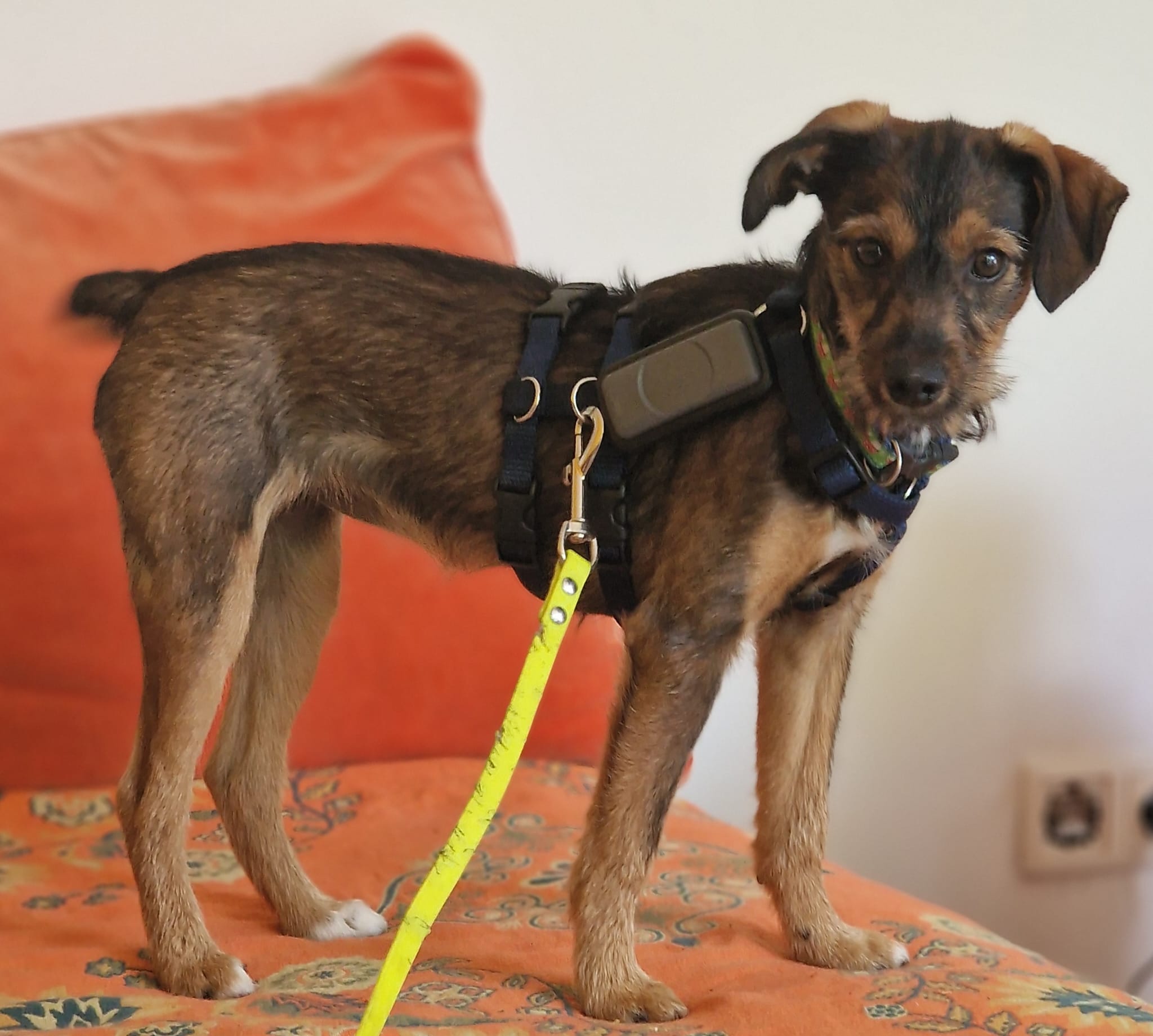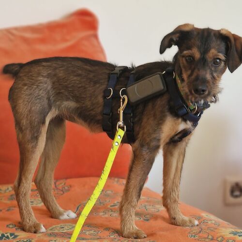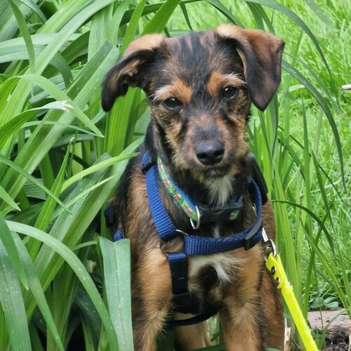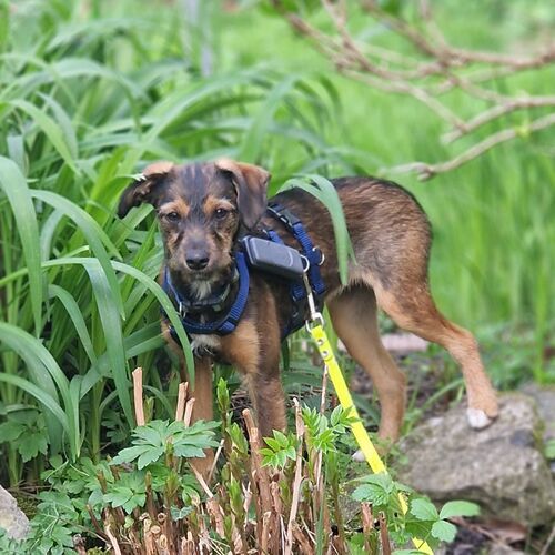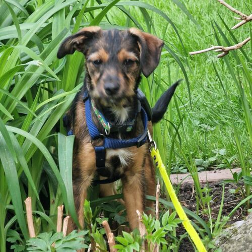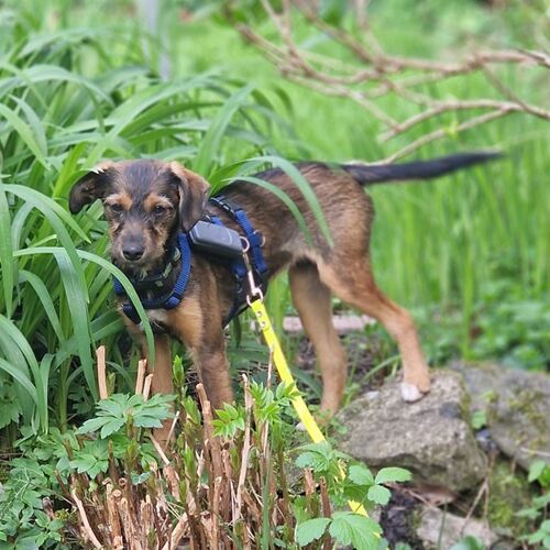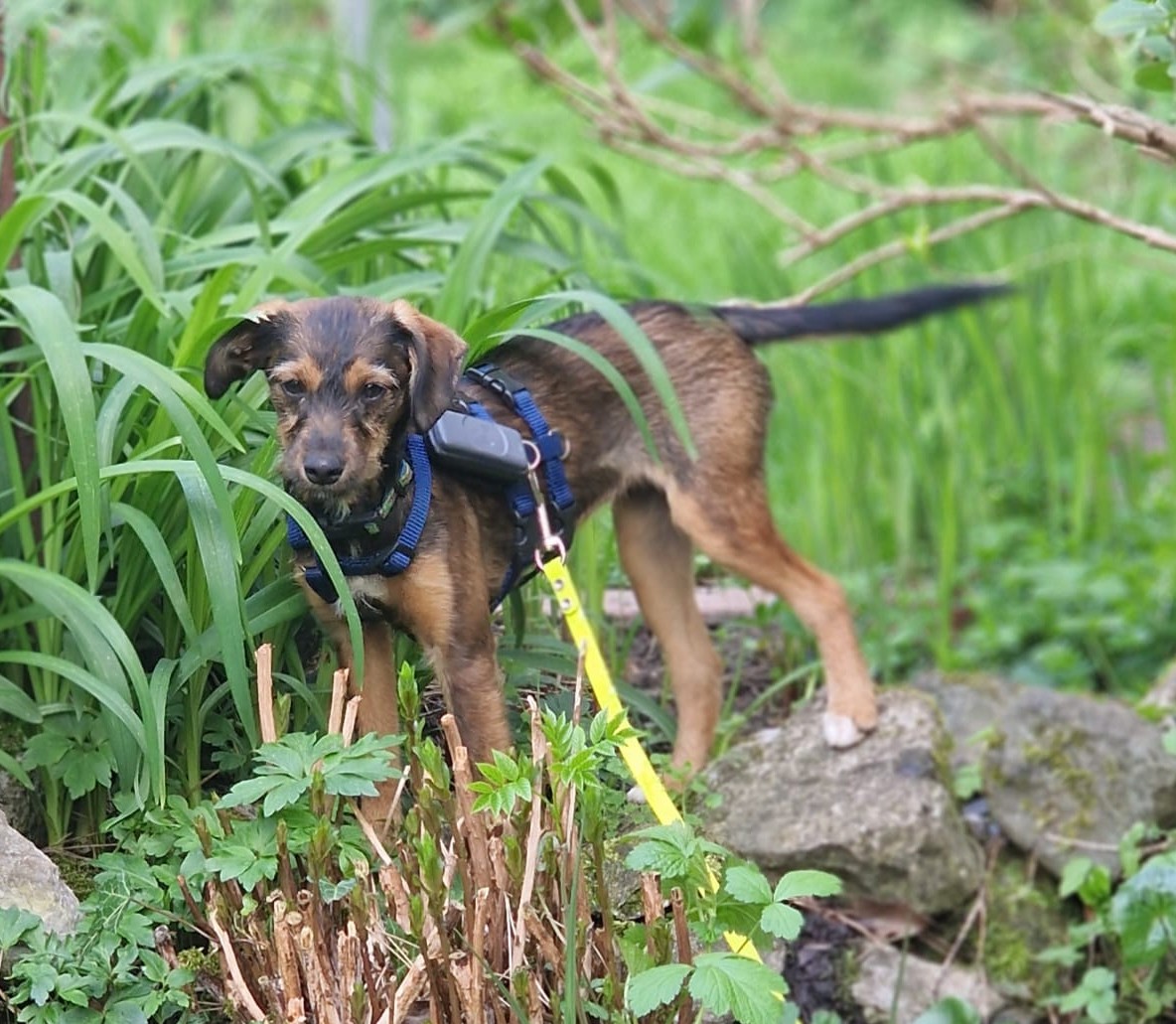Minka ist stubenrein. Welpentypisch ist das Laufen an der Leine noch unkoordiniert und unsicher.