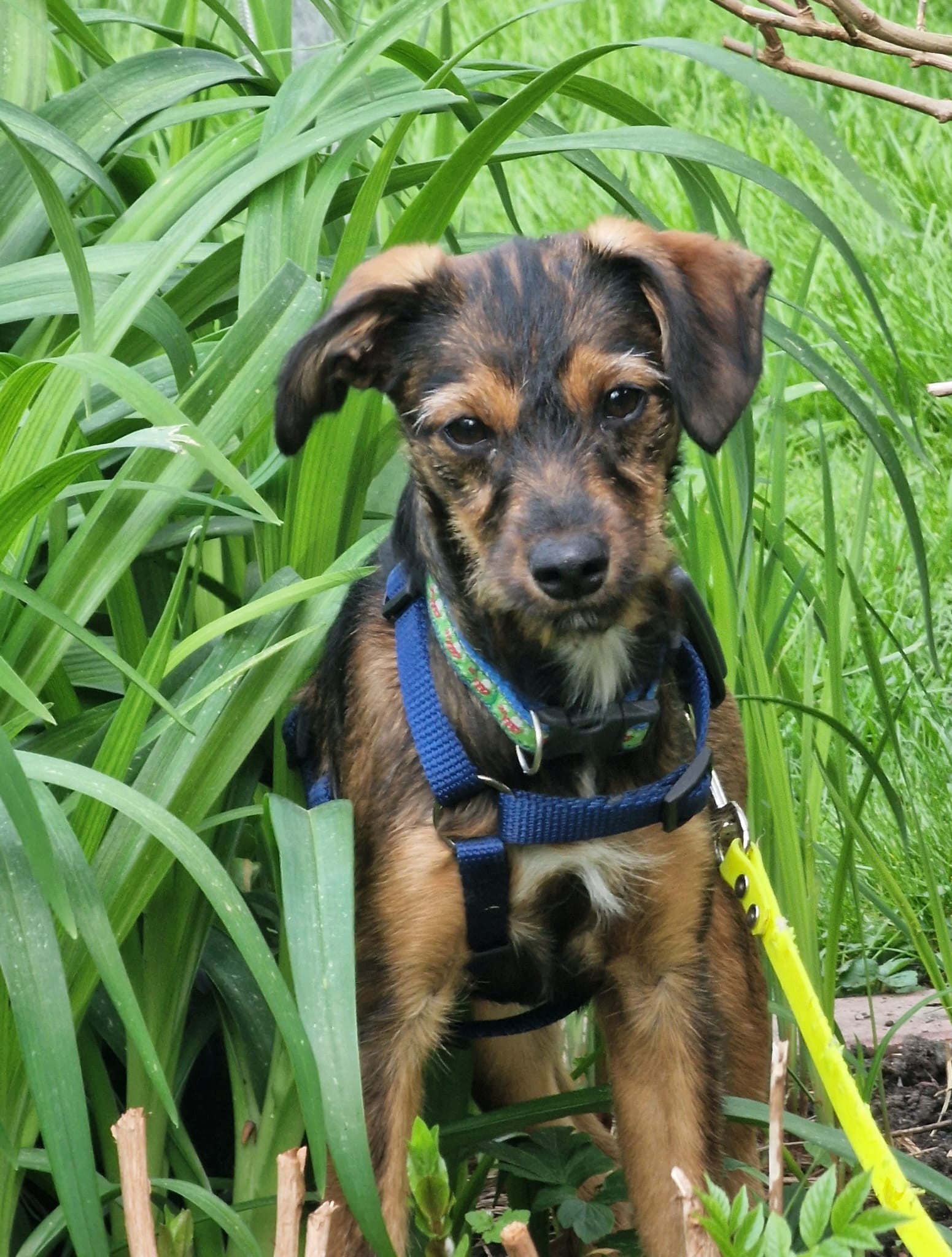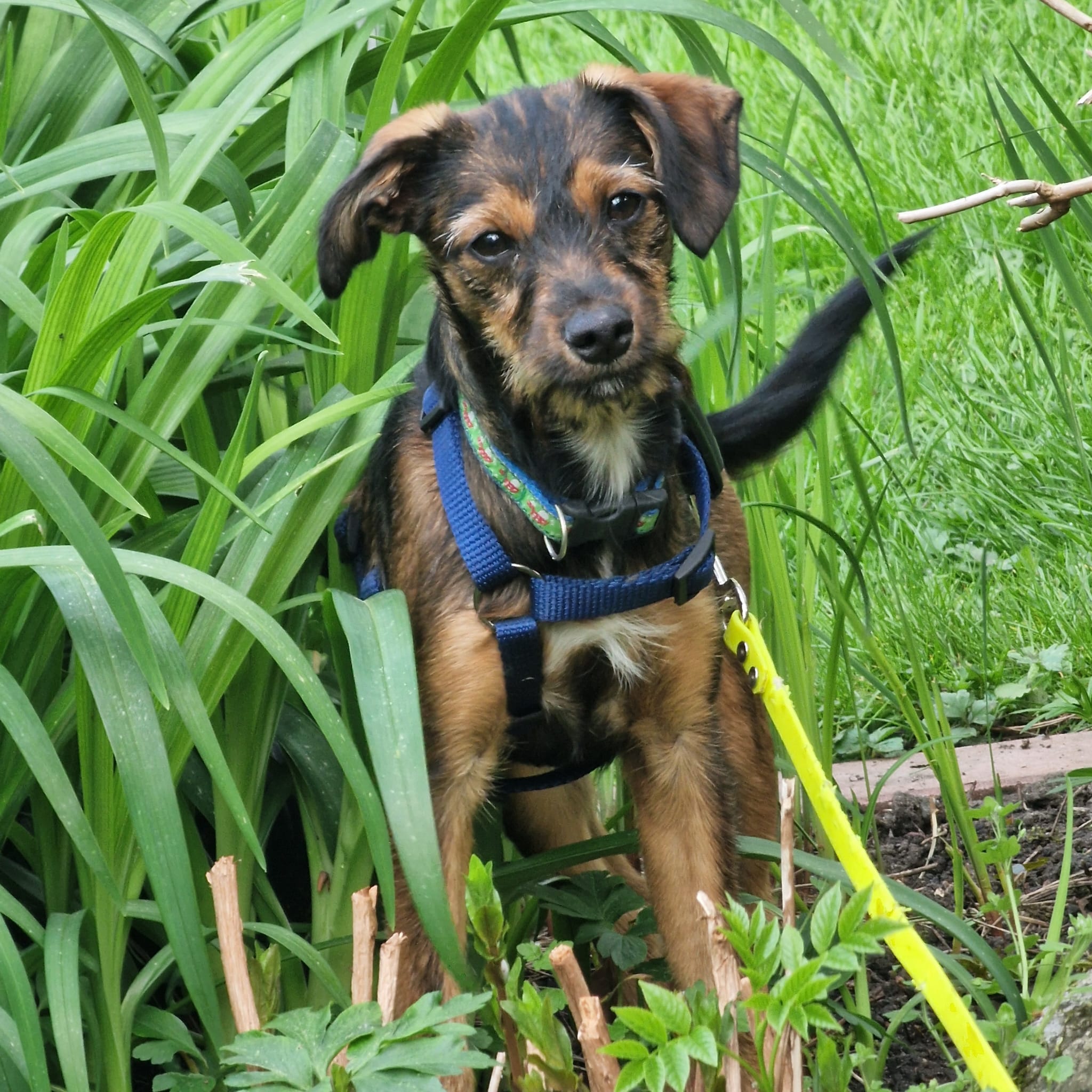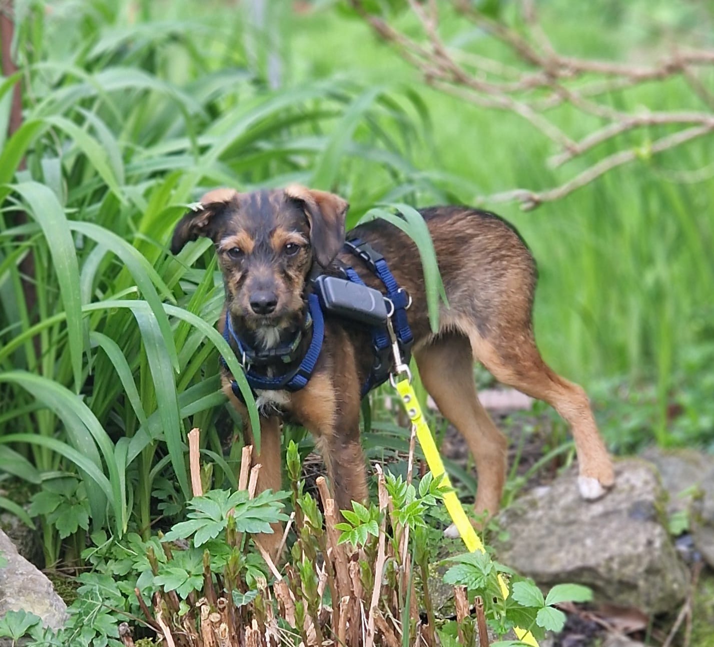 Minka ist stubenrein. Welpentypisch ist das Laufen an der Leine noch unkoordiniert und unsicher.