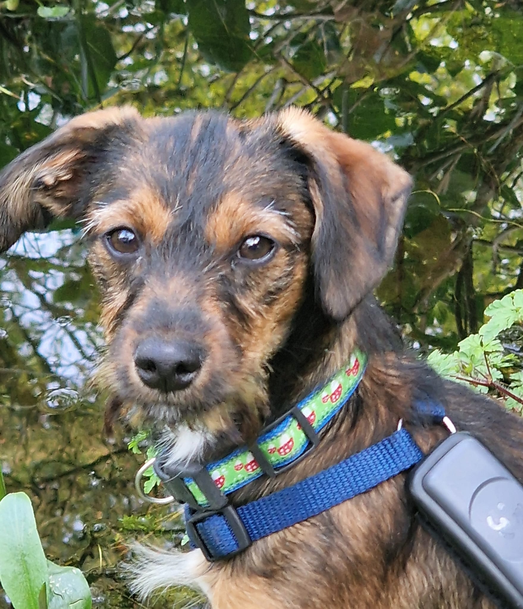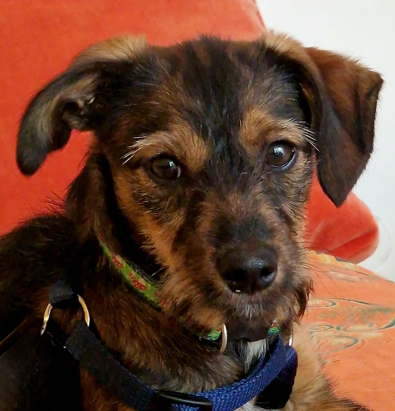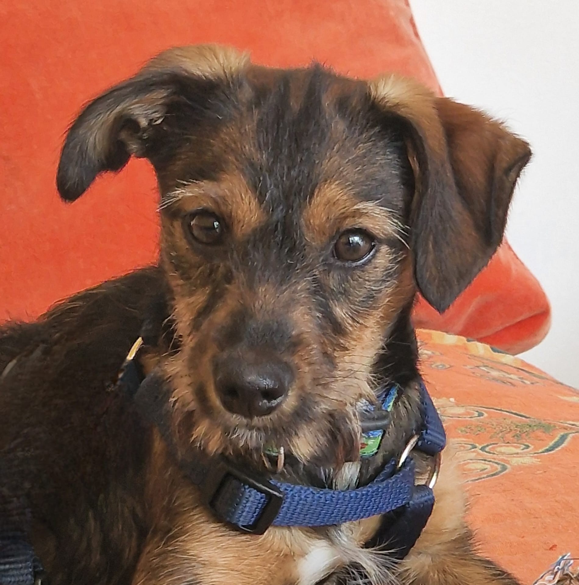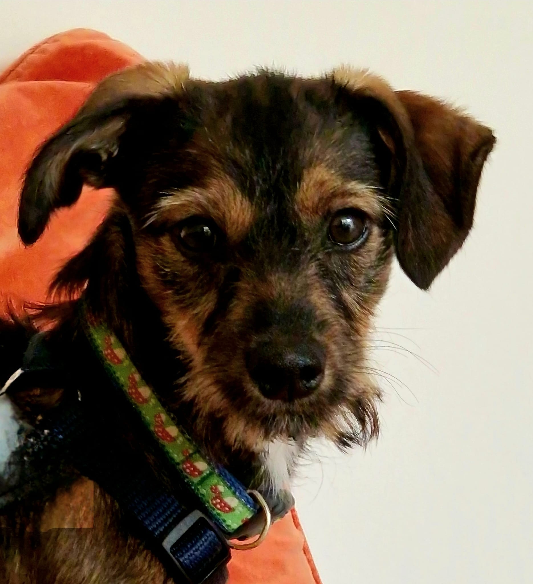 Minka ist stubenrein. Welpentypisch ist das Laufen an der Leine noch unkoordiniert und unsicher.
