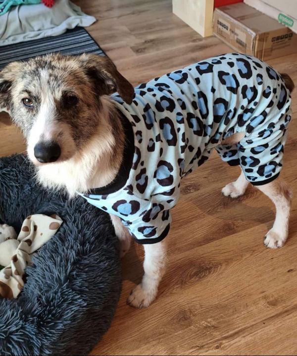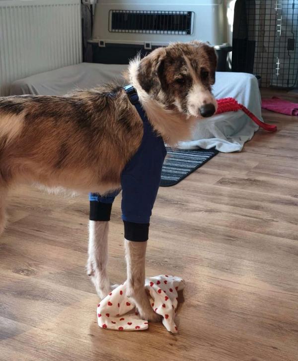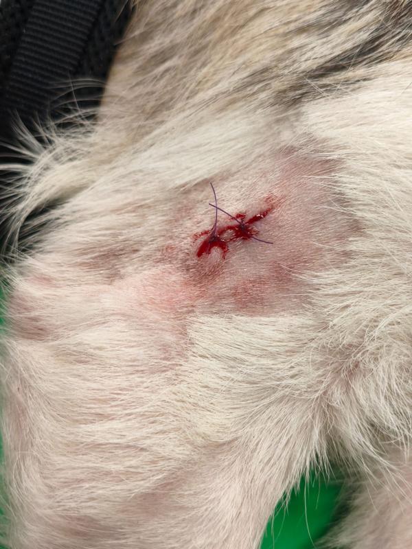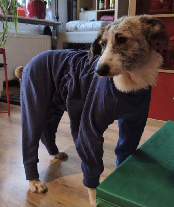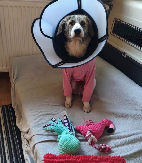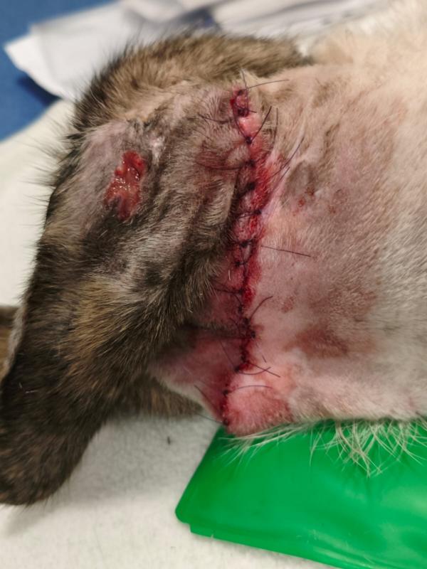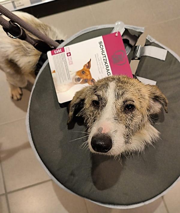 Kalu wurde regelrecht "zusammengeflickt" - hat aber alles sehr gut mitgemacht und auch weggesteckt. Schon kurz nach der OP stand er schon wieder "Körperwedelt" vor uns. Was ein Kämpfer und einfach nur Goldschatz. Wir haben nun ein extra Geschirr und Trichter besorgt, damit die größte Wunde am Hals gut verheilen kann und Nichts daran reiben kann.
